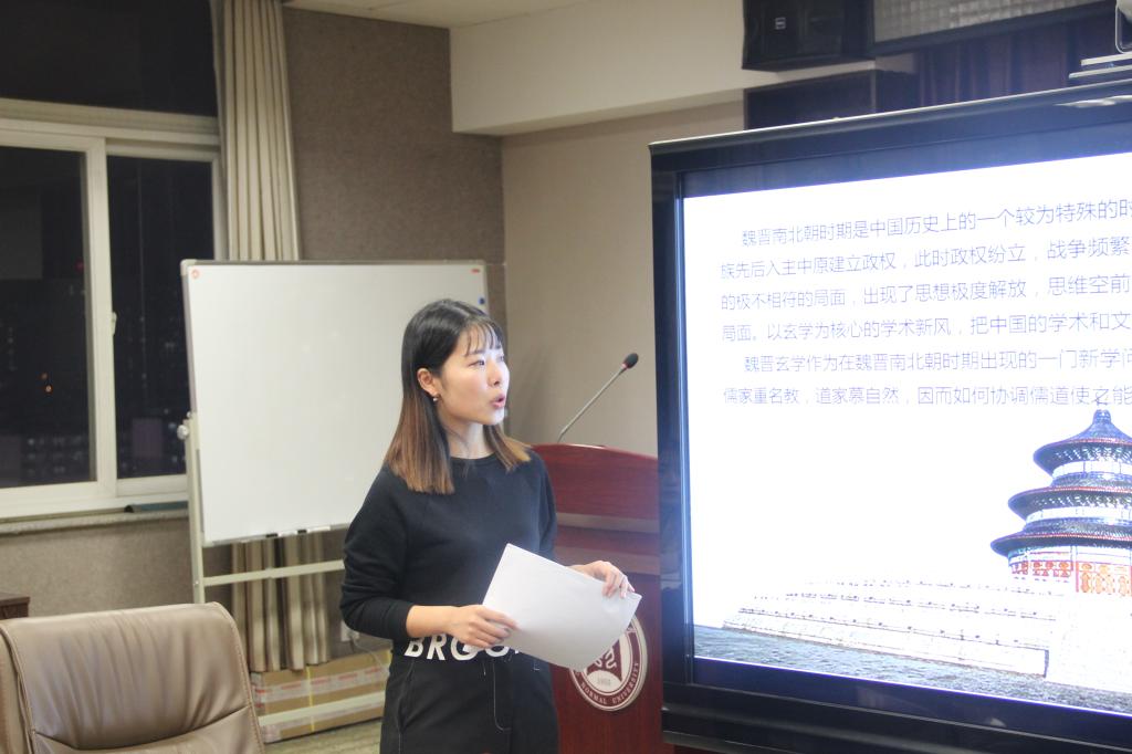 在报告会问题讨论环节,各级研究生针对中西方不同哲学观点展开了热烈地讨论,崔竹青同学提出“王弼如何继承老子思想,又是如何发展其思想”,经过同学们激烈讨论,最终得出:王弼的思想理论从对老子宇宙论向本体论的改造,进入对本体与现象界的结合,以及在社会政治上体用的实践,最终建构了一个系统的哲学思想体系;他运用“辩名析理”和“得意忘言”的诠释方法,从语言的角度对老子之道进行了诠释,最终体现在他的本体论思想中。