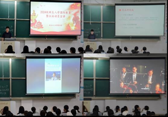 2024级本科新生辅导员张忠凯主持,2021级谢林桦受邀进行国防教育征兵动员宣讲,2024级全体本科新生积极与会。